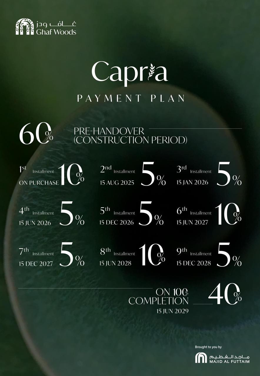 The 60/40 Installment Plan allows buyers to make easy payments over time with an initial down payment and subsequent installments until handover. This structured payment option ensures that homeownership in Ghaf Woods is achievable for everyone.